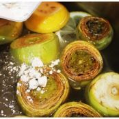 2.- En un plato blanco se puede poner una línea de salsa de pimientos, otra de aceite de albahaca y encima las alcachofas decoradas con cebollino.