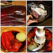 1.- Para que queden jugosos los envolvemos en aluminio de cocina y les ponemos una gotas de aceite. Los cocinamos en horno precalentado a 200ºC unos 45 minutos. Los enfríamos un poco, les quitamos las pepitas y la piel y los trituramos con el jugo de asar los pimientos y un poco más de aceite y sal.