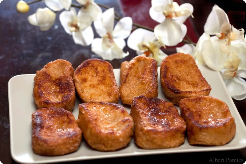 -Una vez remojadas las rebanadas de pan pasarlas por huevo batido y las freímos en aceite de oliva bien caliente.