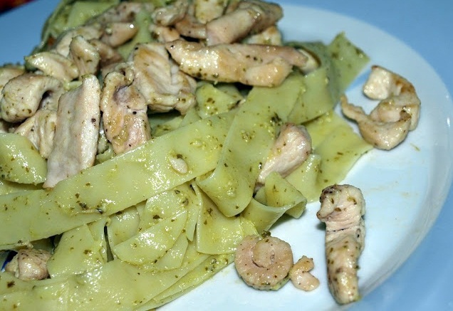 Nidos de pasta con pollo al pesto