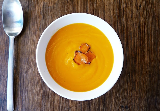 Colocamos la mezcla de verduras en la batidora de vaso y procesamos hasta que quede una mezcla suave. Añadimos sal y pimienta. Servimos caliente.