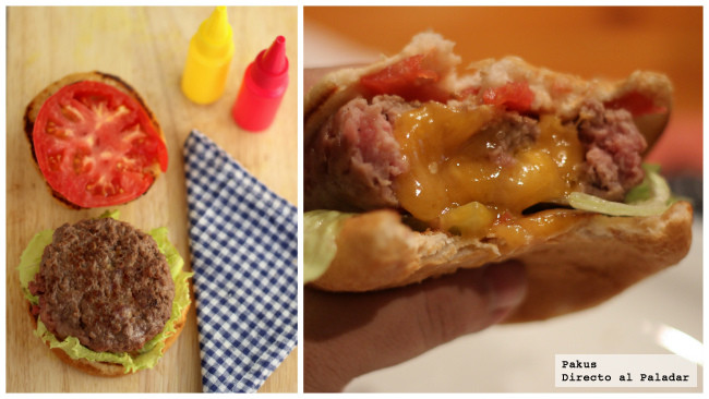 En el centro de cada hamburguesa ponemos un buen trozo de queso cheddar, y con cuidado vamos recubriéndolo de carne picada hasta que desaparezca el queso, totalmente envuelto. Es preferible que la hamburguesa quede más bien alta que ancha para que el queso quede situado en el corazón de la hamburguesa.
