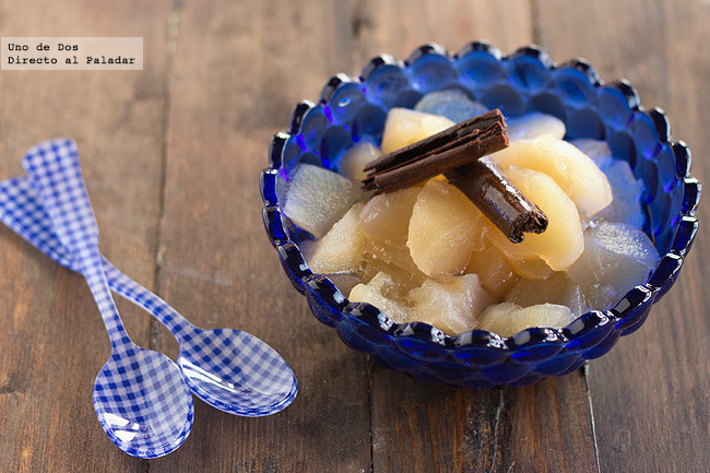 Mientras, lavamos, pelamos y descorazonamos las manzanas. Las troceamos y añadimos a la cazuela justo cuando el almíbar está hecho y sigue burbujeando ligeramente. Ponemos la ramita de canela, tapamos la cazuela, bajamos el fuego y cocemos durante unos 30 minutos.