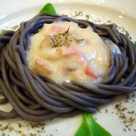 ESPAGUETTI DE SEPIA CON BACON Y CEBOLLETA .SALSA CARBONARA Y QUESO GRANA PADANO