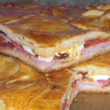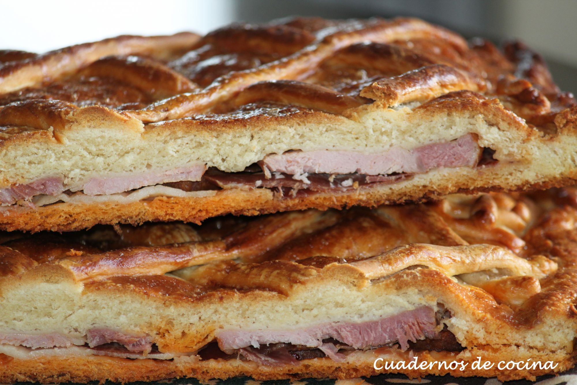 Cubrimos con la otra mitad de la masa y sellamos bien los bordes. Decoramos el hornazo con unas tiras de masa formando un enrejado. Pinchamos con un tenedor y untamos con un huevo batido toda la superficie.