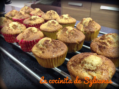Repartimos la masa en las capsulas hasta llegar al borde. Y espolvoreamos un poquito de azúcar y canela por encima. Horneamos durante 20 min. a 180º con ventilador.