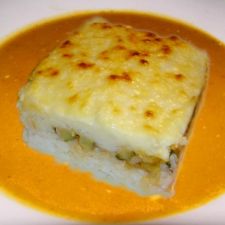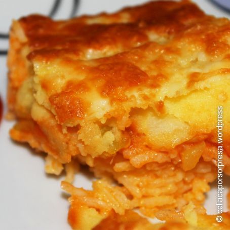 En una bandeja apta para horno emplatamos, poniendo una capa de arroz, encima el sofrito de calabacín y tomate frito y por último el puré de patata. Echamos por encima abundante queso rallado y gratinamos en el horno unos 5-7 minutos hasta que la capa de arriba adquiera color marrón.
