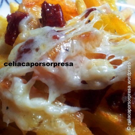 El otro día viendo el típico programa de televisión americano de comida basura en el que sólo enseñaban recetas con gluten, pitas variadas, salsas impensables y revueltos de infarto… nos entraron unas ganas tremendas de cenar algo rico, contundente y no apto para personas a dieta. Así que preparamos este revuelto de patatas con chorizo típico de feria, porque un día al año no hace daño. Apto para celíacos.