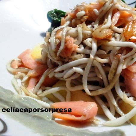 Ensalada templada de gulas, salmón ahumado y manzana con salsa de cabrales