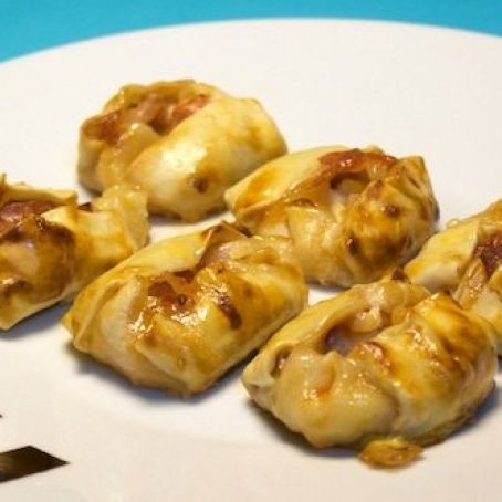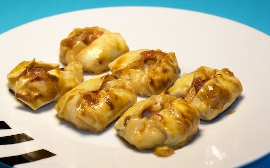 Una vez tenemos todos los paquetitos listos, los ponemos en una bandeja con papel de hornear, los pintamos con huevo batido y horneamos a 200º durante 8 minutos. Dejamos reposar un par de minutos y servimos caliente.