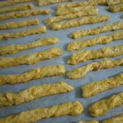 Precalentar el horno a 200ºC 10 minutos antes de que acabe el reposo de la masa.Sacar la masa de la nevera y extenderla sobre un papel de horno (ya que así la trabajaremos mejor), hasta dejarla con un grosor de entre 1/2 y 1 cm.Cortar en palitos y hornear unos 20-25 minutos o hasta que estén dorados.Sacar a una rejilla y dejar enfriar para que los palitos adquieran una textura crujiente.
