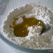 Mezclar la harina con un poco de sal y la levadura.Añadir las 4 cucharadas de aceite y mezclar hasta que la harina absorba todo el aceite.