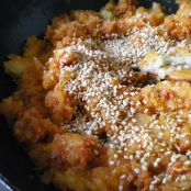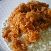 Picar la cebolla fina (queda mejor con picadora eléctrica).En una sartén mediana echar un poco de aceite de oliva y dorar la cebolla añadiendo una pizca de sal.Picar mientras tanto el chorizo, igualmente fino y añadir a la cebolla, una vesz que ésta haya tomado color.Poco antes de terminar de sofreír todo, añadir la cucharada de sésamo.