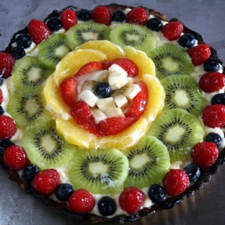 Cortar las frutas a trocitos pequeños e ir colocando encima de la crema pastelera