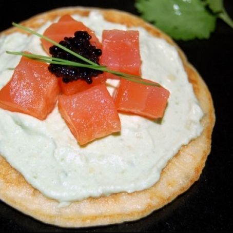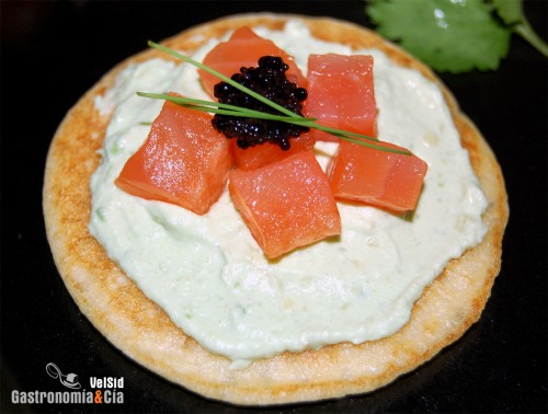 - Blinis, queso crema de aguacate, salmón marinado, huevas de lumpo, cebollino o cilantro.
