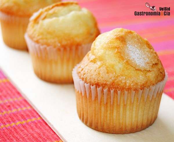 Acto seguido, necesitaremos unos moldes para echar esta mezcla; la echaremos hasta la mitad, espolvoreamos un poco de azúcar por encima y horneamos a 180º durante 20 minutos; hasta que veamos que están subiendo las magdalenas.