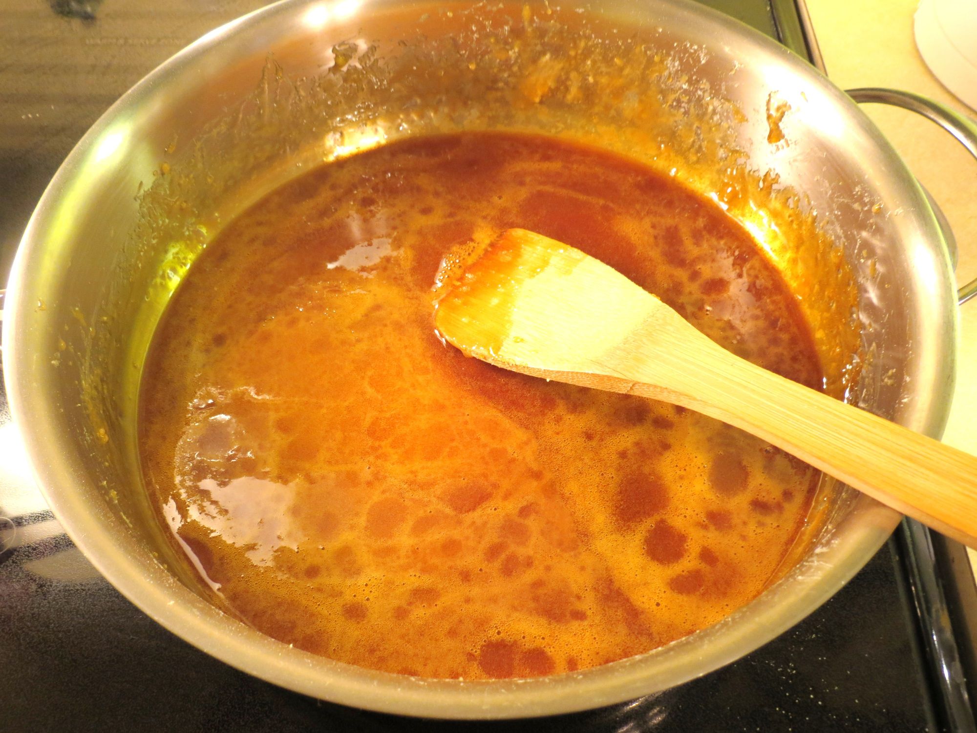 Cuando esté el caramelo tostado apartar la cazuela del fuego. Si el caramelo se endurece incorporar 1 cucharada sopera de agua y volver a poner a fuego lento.