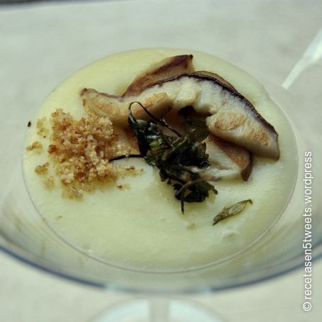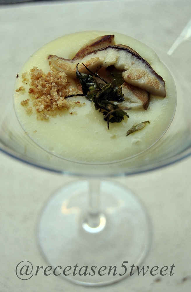 Un delicioso puré de patatas emulsionado con aceite de haber confitado hongos y ajos negros.
