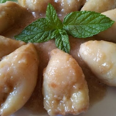 En una cacerola pochar la otra cebolla, cortada en aros, añadimos el majado que tenemos en el mortero, lo que nos queda del vasito de vino blanco, el caldo de pescado, dejamos reducir la salsa cinco minutos, pasándola después por la batidora, añadimos los chipirones y dejamos cocer durante 8 o 10 minutos a fuego medio. Si la queréis más espesa le podéis añadir unas cucharadas de maizena