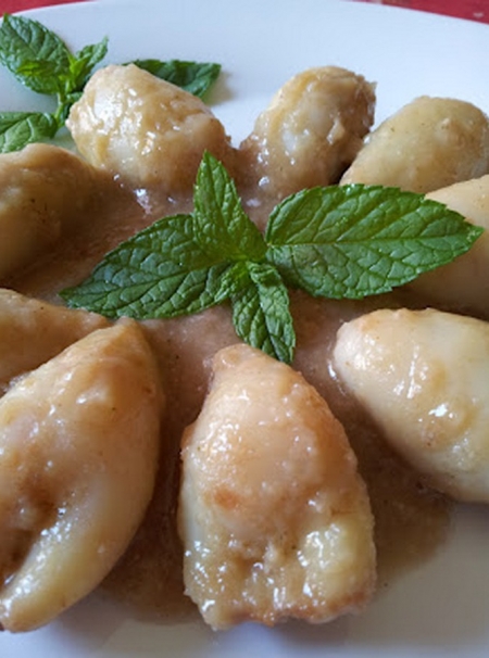 Escurrimos bien el sofrito del aceite, con la ayuda de una manga pastelera desechable, le hacemos un corte en la boquilla y vamos rellenando uno a uno los chipirones, no los llenéis mucho por que luego tendremos que cerrarlos con la ayuda de un palillo para que no se abran al freírlos.