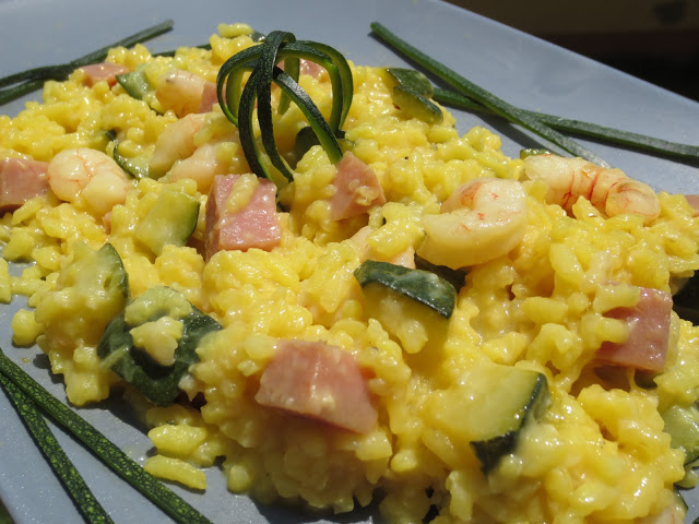 2 minutos antes de que finalice la cocción añadimos el calabacín con las gambas que teníamos reservadas para el arroz.