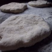 Extiende con el rodillo cada bola, en discos finos, de unos 4 mm. de espesor. Lo suficiente para que se hinchen, si los aplanas mucho, no subirán como deben.