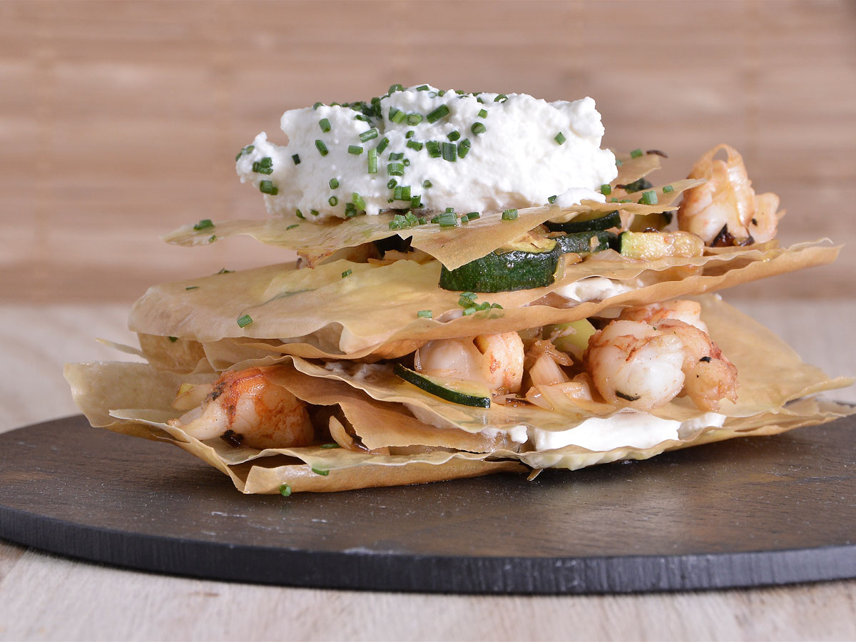 Cuando la pasta esté lista, montamos las milhojas alternando capas de pasta filo con capas de sofrito y ricotta.