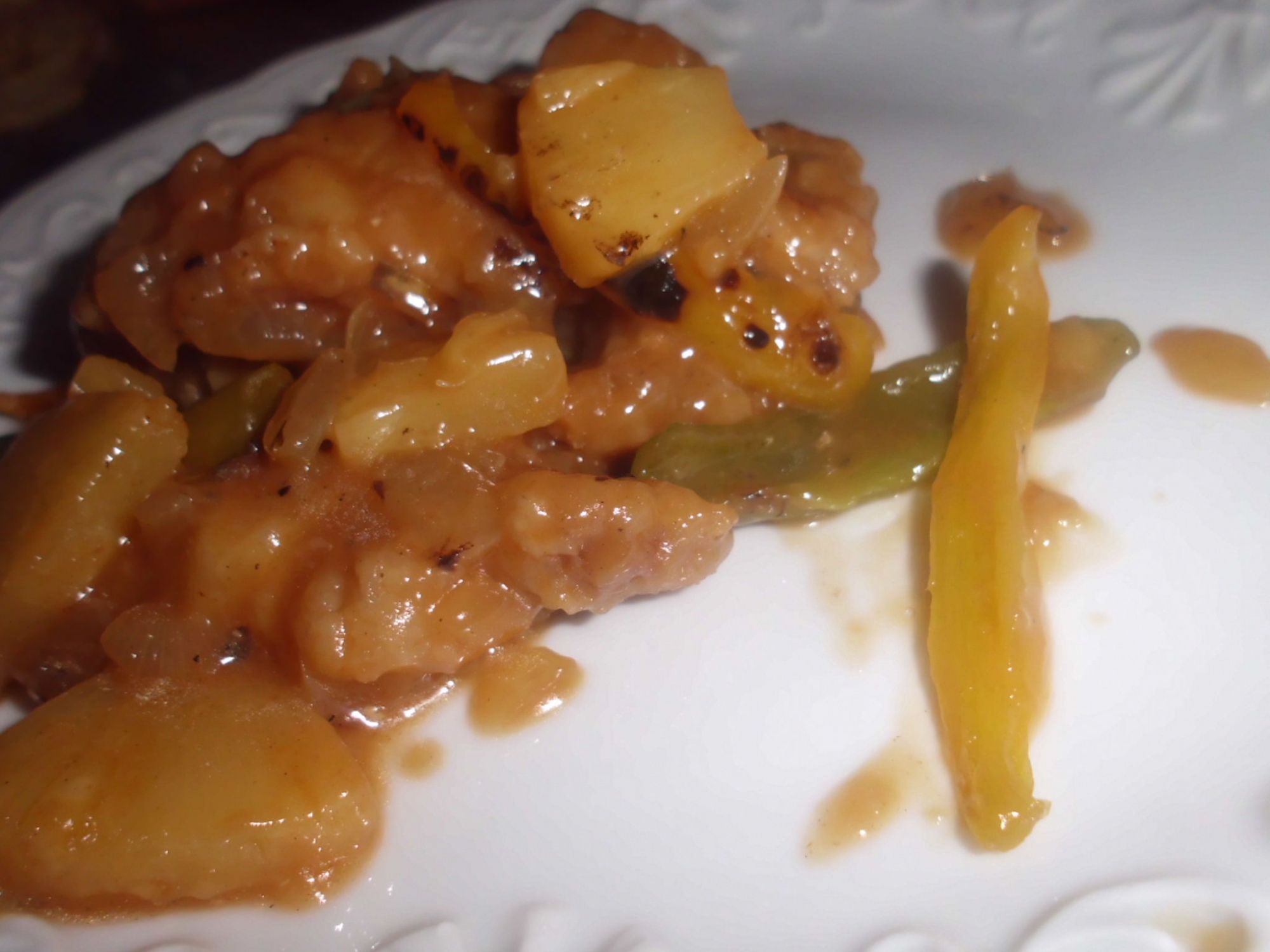 Mientras se hacia la salsa puedes ir cortando la cebolla a trocitos, los pimientos en tiras finas y la piña en trozos.