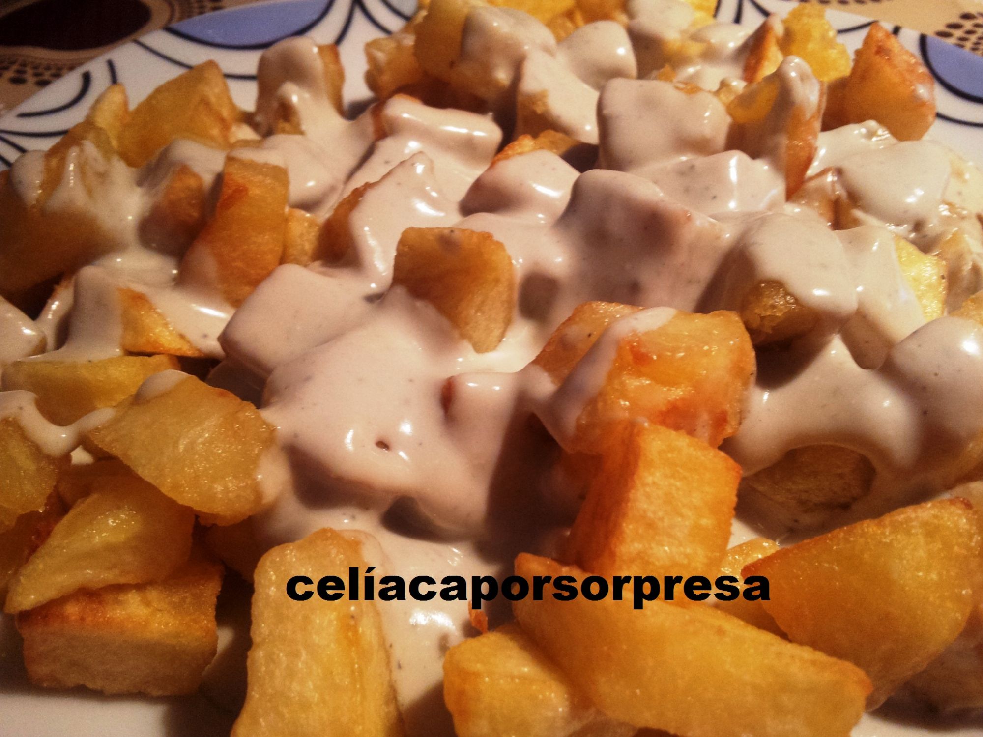 Cuando las patatas estén fritas, las escurrimos en papel absorbente, les ponemos una pizca de sal y emplatamos sin papel esparciendo la salsa bien caliente por encima.