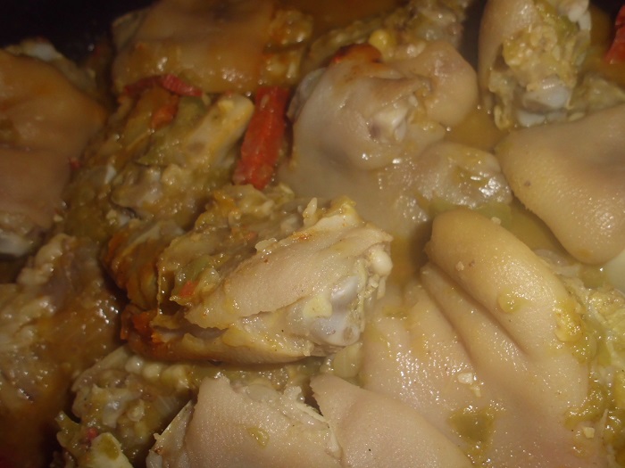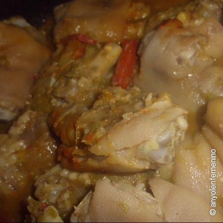 Cuece las patas de cerdo con la cebolla y los ajos y un poco de aceite, hasta que estén blandas.
