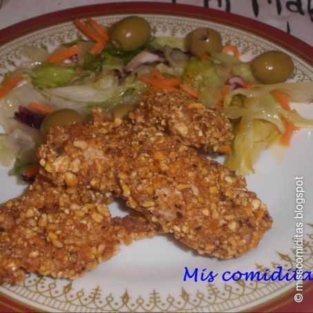 Pasar las tiras de pechuga por el huevo y luego por los quicos, apretándo bien.