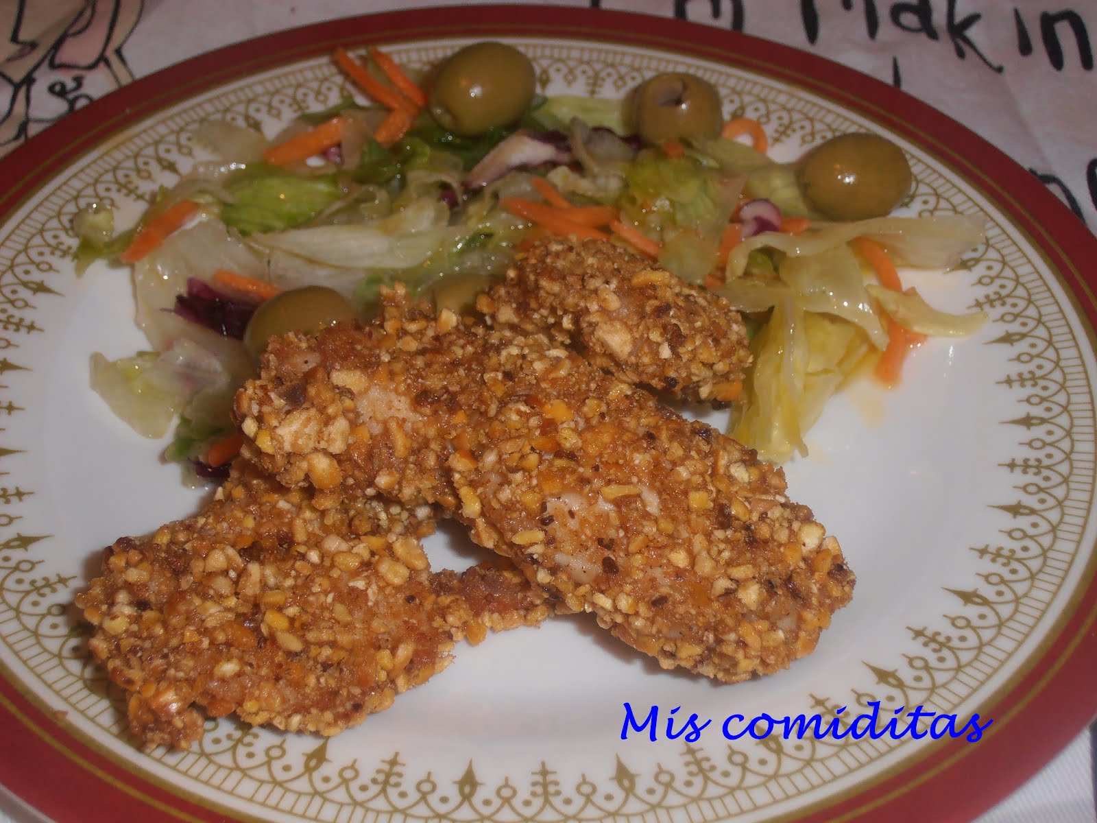 Cortar las pechugas de pollo en tiras y aliñarlas con sal, pimienta y limón.