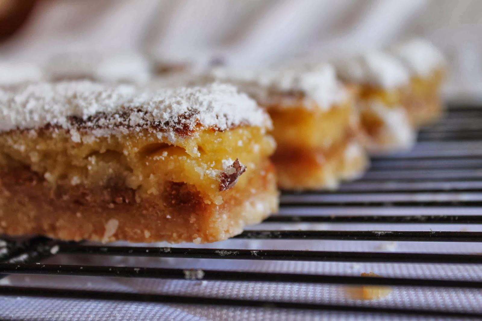 Distribuir la mezcla sobre la base, ligeramente fría, y hornear durante unos 30 - 35 minutos. Dejar enfriar en el molde, y terminar de enfriar en una rejilla. Para ello, nos ayudamos del papel de hornear para desmoldar entera la preparación. Cortar una vez que esté totalmente frío.