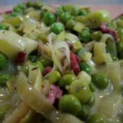 Pelamos los ajos y los laminamos. Cortamos el puerro en tiras. Troceamos el jamón en taquitos. Sacamos los guisantes de su vaina. (Aunque también se puede hacer con guisantes congelados).