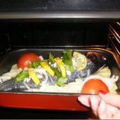 Hacemos 4 rajas a la lubina y metemos dentro las medias rodajas de limón, y cortamos un tomate maduro por medio, y ponemos a los lados.