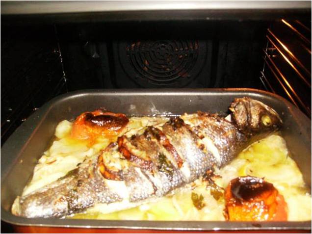 Ponemos un poco de perejil sobre la lubina y lo rociamos todo con 5 cucharadas de aceite de oliva.