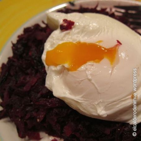 Colocamos un huevo pochado encima de cada panqueque de remolacha y… ¡a disfrutar y a mojar pan! :)