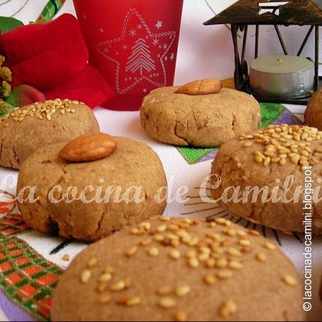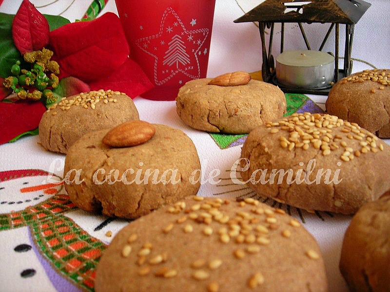 En un recipiente hondo, mezclamos todos los ingredientes ayudándonos con una cuchara o con las manos, yo los hice así. La masa tarda en integrarse y hay que manejarla bien, porque tiende a cuartearse. Una vez bien integrados los ingredientes, sólo debemos coger pequeñas porciones de masa y le damos forma aplanándolas con las manos y dándole forma redonda. Los iremos colocando en la bandeja del horno con papel vegetal, lo decoramos con una almendra entera o sésamos tostados, y horneamos a 180º unos 20-30 minutos. Yo los horneé poniendo la bandeja en el nivel cuarto empezando desde abajo, dejamos enfriar por completos antes de manipularlos porque podrían desmonorarse.