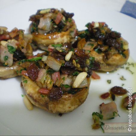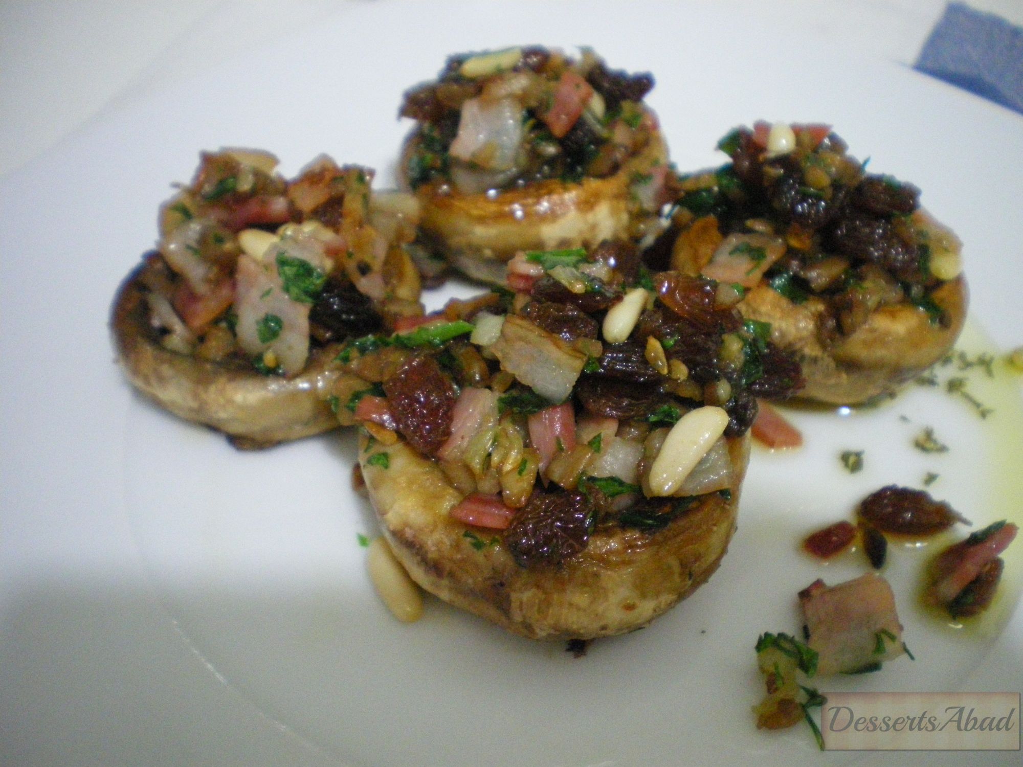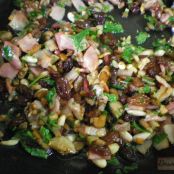 Dales la vuelta y fríe otros 3 minutos.Salpimienta e incorpora el sofrito de bacon, piñones, pasas y perejil, rehogando 1 minuto más.Servir inmediantamente para degustarlos bien calentitos.