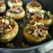 En la misma sartén y aprovechando el jugo pon los champiñones a freir primero con el sombrero boca abajo, a fuego lento durante 4 minutos.