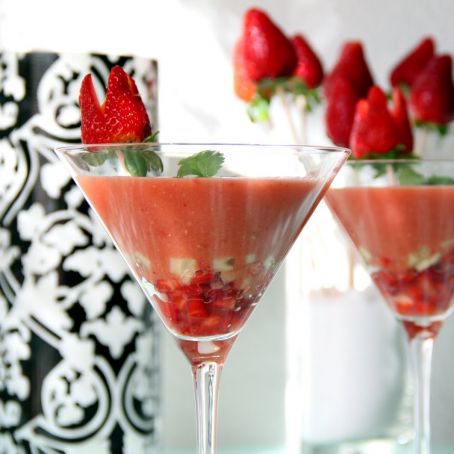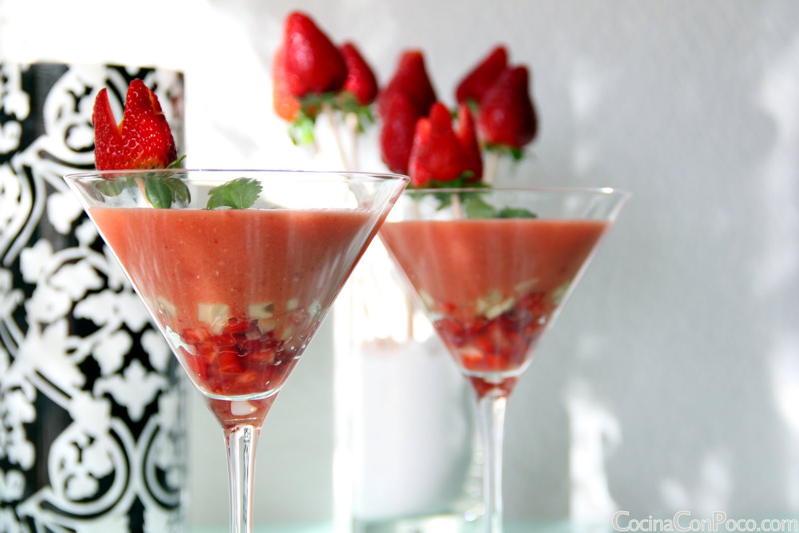 Para la presentación de puede poner en una copa unas fresas cortaditas con un poco de gelatina en el fondo, encima el gazpacho y se puede decorara con hierva buena