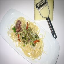 Cestitas de pollo con crema de anchoas y alcaparras Pasta con habitas tiernas , anchoas y queso