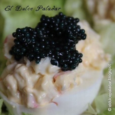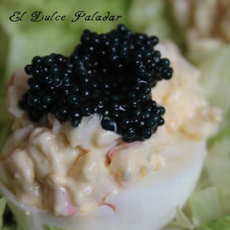 Ponemos a calentar agua en una olla y cuando hierva con mucho cuidado y ayuda de una cuchar ponemos los huevos uno a uno ( esto se hace así para que la yema quede en el centro del huevo ya cocido), dejamos unos 10 minutos y sacamos para dejar enfriar. ( yo los hago en mi olla fussioncook , poniendo un vaso de agua en la cubeta, los huevos y cerrando la olla, menú huevos). Cuando estén fríos les quitamos la piel y cortamos al largo del huevo, le quitamos la yema y colocamos en un bol , junto a los palitos picados, el atún desmigado y estrujamos todo, mezclamos con unas cucharadas de mayonesa y procedemos a rellenar los huecos de las claras que hemos reservado, luego ponemos una cucharadita de huevas de lumpo ( falso caviar) y ponemos al frió hasta que vayamos a consumirlos...