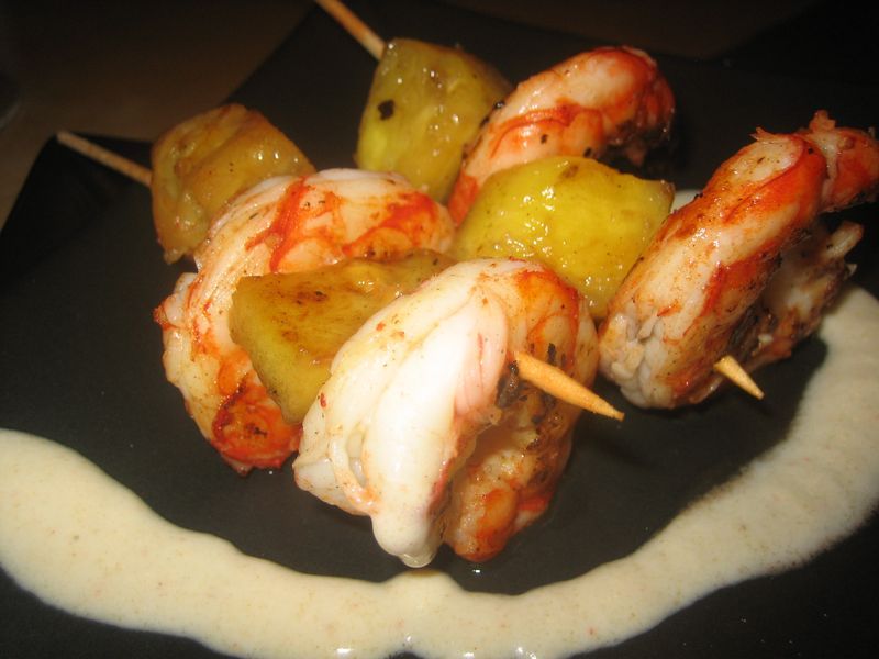 En una brocheta grande, insertad un gambón, un trozo de piña y un trozo de mozzarella y volved a colocar otro gambón y finalizando un trozo de piña.