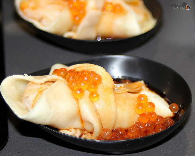 Pintxo de lazos de langostinos con aceite de marisco y huevas de salmón