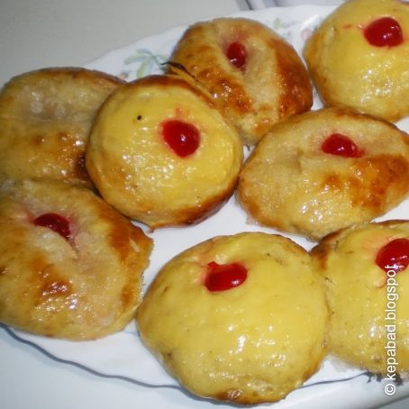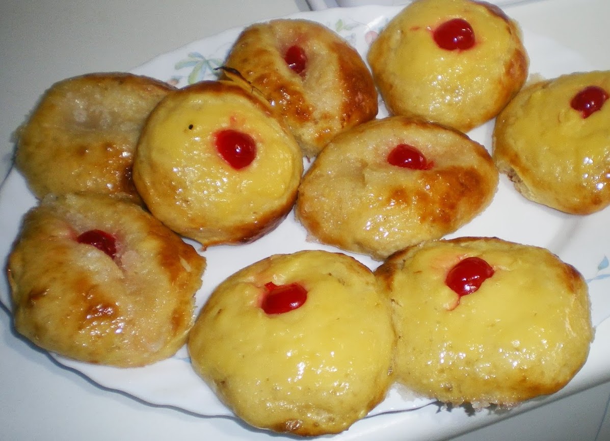 Cuando haya fermentado cojemos pequeños trocitos de masa de unos 40 g y hacemos los bollitos.Los vamos poniendo en la placa de horno con separación pues luego crecen ,dejamos reposar .Cuando doblen el tamaño (24 horas) adornamos con la crema pastelera y las cerezas o simplemente con azúcar húmeda(100 azúcar avainillado+1 o 2 cucharadas de agua de azahar),pintamos con huevo y los metemos en el horno ya caliente a 190º hasta que estén dorados unos 10 a 15 minutos,sacar del horno dejar enfriar un poco y pintar con almibar de azúcar ( agua y azúcar en la misma cantidad cocido durante 1 o 2 minutos ) mezclado con un poco de mermelada de albaricoque o de naranja ,eso al gusto.