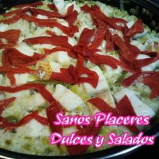Se añade el bacalao a la sartén y se deja que se haga un poco junto con las cebollas.