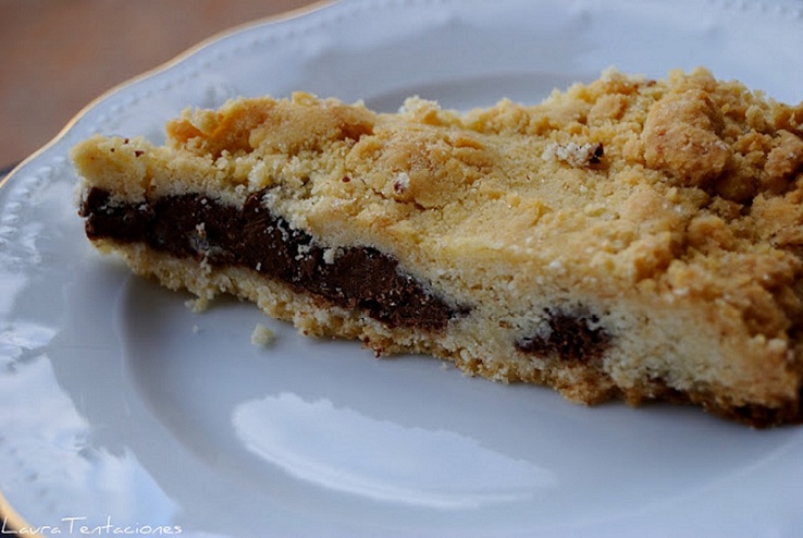 Tapamos con el resto de la masa, esta vez sin presionar demasiado. Yo aprieto un poco de masa entre las manos para que queden trozos mas gorditos. Cubrimos así todas la superficie. Precalentamos el horno a 200°C y horneamos durante unos 20 minutos, no debemos pasarnos o nos quedara como una piedra.