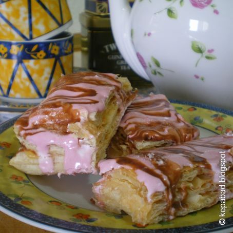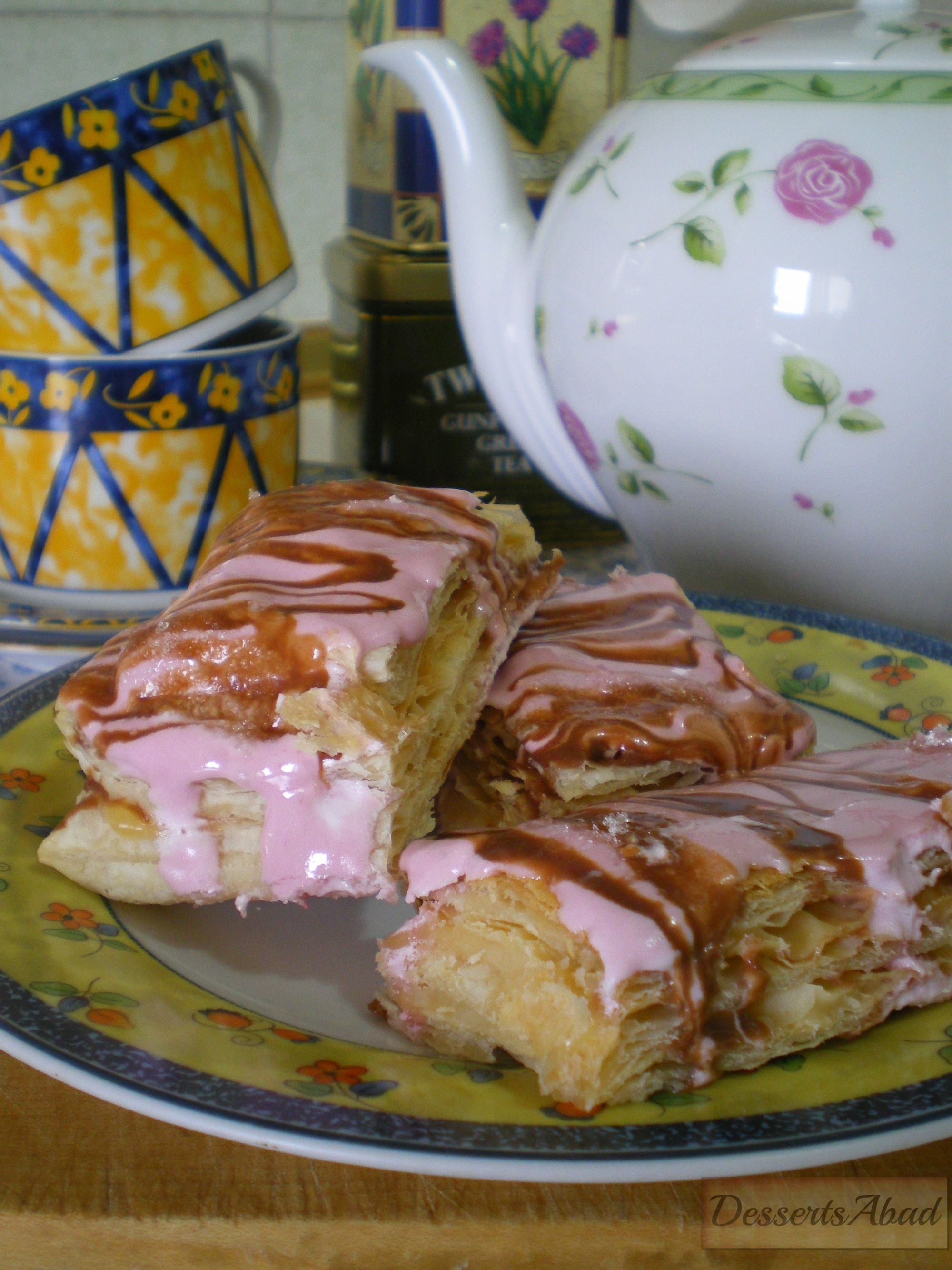 Pasteles de hojaldre rellenos de deliciosa crema pastelera y glaseados con fondant rosa, deliciosos para una merienda o sobremesa.