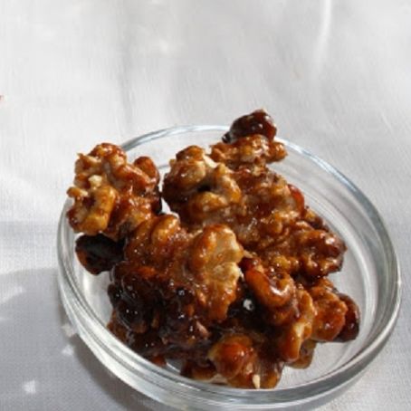 Poner el microondas a potencia máxima durante un minuto. Veréis que el azúcar se habrá disuelto en el agua y quedará un líquido parecido a un jarabe, remover bien las nueces para que se impregnen del jarabe.